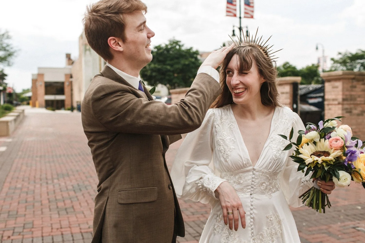 Once we booked the Theatre, I searched on Etsy for 1920s silk gowns. I found a great maker in Vietnam with a variety of styles, all I had to do was send her my measurements. Even though it was a summer wedding, I fell in love with the billowy bishop sleeves and the deep center cut. The excess fabric from the circle skirt made the dress pretty heavy, but when the wind came through and swept it up I felt incredible. I did my own makeup, hair and nails, and had fun with the accessories. I didn't want to wear a standard veil, so I looked for a sunburst crown on Etsy that would match my dress. I wore one made out of bamboo with Swarovski crystals to embrace the glamorous Art deco theme. My engagement ring fits on my index finger, and has 9 baguette diamonds for the 9 years we've been together prior to marriage. I wore the sterling silver ring he gave me 5 years ago on my right hand. It may not be the most pretty looking anymore, but it is probably my most prized possession.